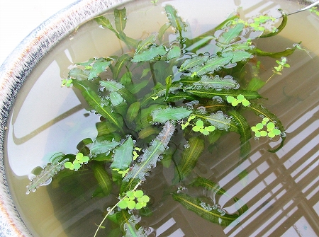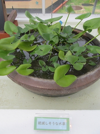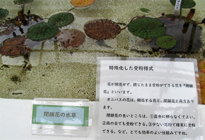 ![]() 左)ササバモ(沈水葉の水草) 右)ヒシ(一年草で池沼に生え、種子は食用にされる) |