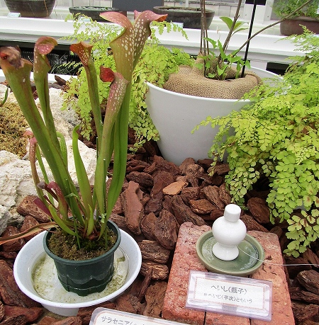 ![]() サラセニアの和名はヘイシソウで、葉が筒になっているのを酒器の瓶子(へいし)に見立てたものである。 |