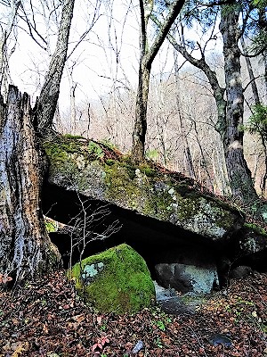 ![]() 「石ヶ戸」とは、この地方の方言で、「石でできた小屋」という意味。 桂の木に支えられた大きな一枚岩は、その名のように小屋にも見えます。 |