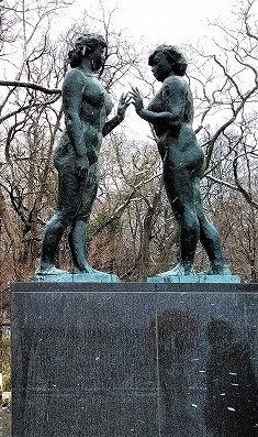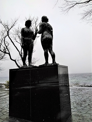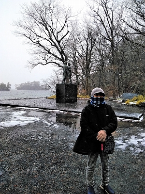 ![]() 雪交じりの木道は滑りやすくやっとたどり着いた乙女の像(ほぼ叔母さんの像) 詩人で彫刻家の高村光太郎作の一対のブロンズ裸婦像。高村作品のなかでも傑作と名高い。 |