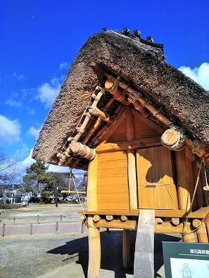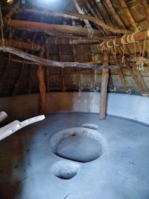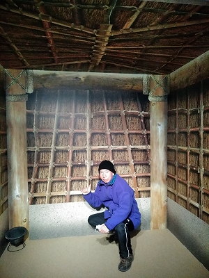 ![]() 左後方は竪穴住居 中)竪穴住居内部 右)高床倉庫 |