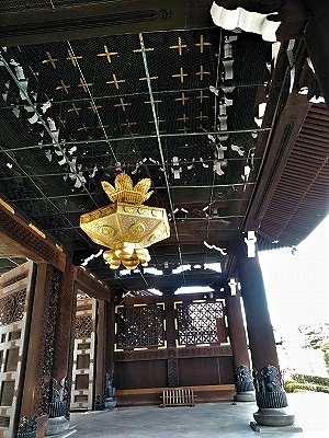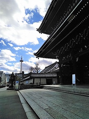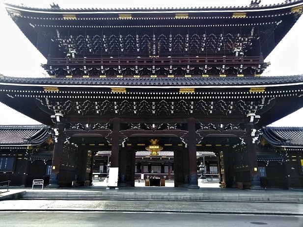 ![]() 御影堂門ごえいどうもん 高さ27m、正面21m、側面13mで木造建築山門で世界一大きい ![]() |
