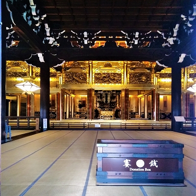 ![]() 内陣は、『仏説阿弥陀経』の世界が表現され、天井から柱にいたるまで金色で荘厳されています。 |