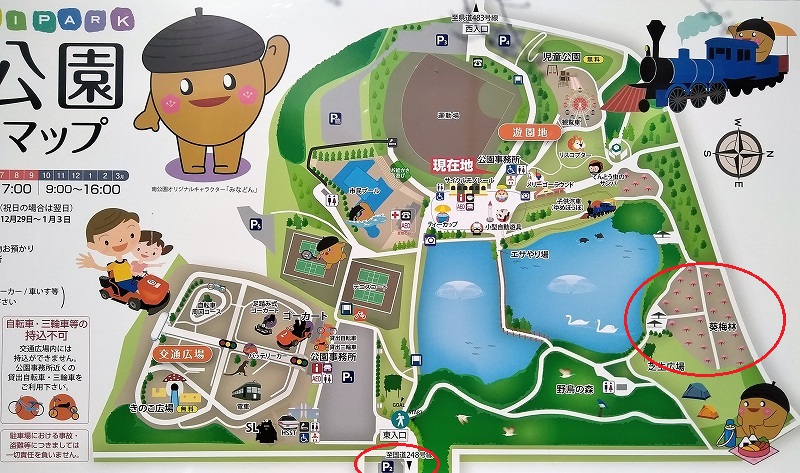 東駐車場からカラー野鳥の森(ベンチで昼食)を抜け梅園に向かいます
