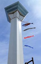 五稜郭タワーの鯉のぼりに交じり鮭の幟が混じる