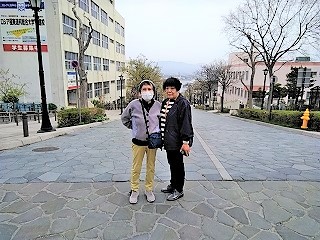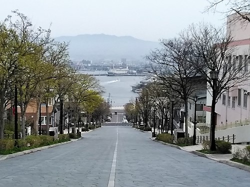 八幡坂 海に浮かぶのはかつて運行していた青函連絡船・摩周丸。現在は記念館となっています。