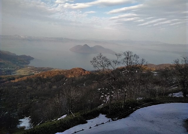 残雪を眺めウエルカムドリンクに夕暮れの洞爺湖