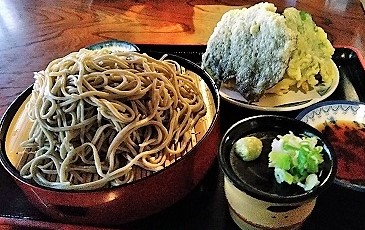 ![]() 山ぶどうの葉の天ぷらは初めて食べました。 天ざるそば大 \1300(天ぷら饅頭\60) 麺は少し硬め |