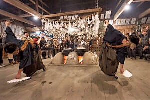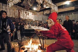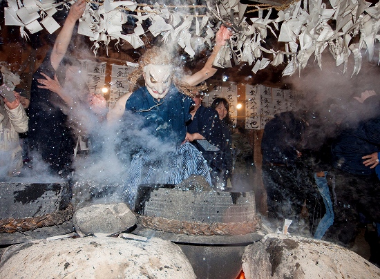 ![]() 古い神社の中でいろいろなお面をかぶって八百万の神に扮した村人が、 次々と煮えたぎった大きな釜の周りを、踊りながら熱湯を素手ではねとばす。 信州HPから |