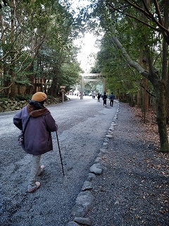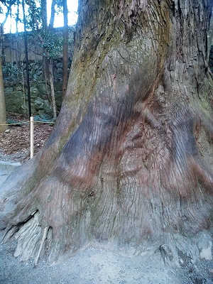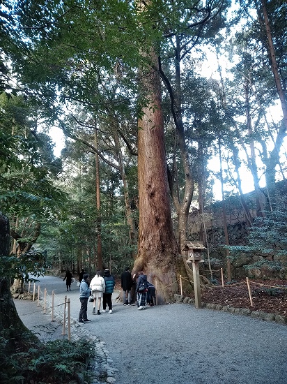 ![]() 正殿から荒祭宮へ行く参拝道に立つ霊験新たな古木神宮杉 |