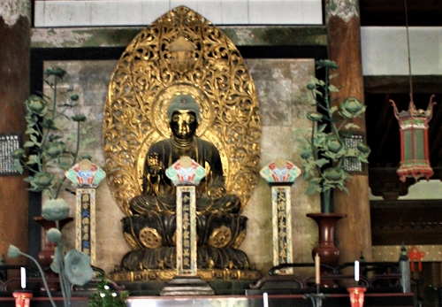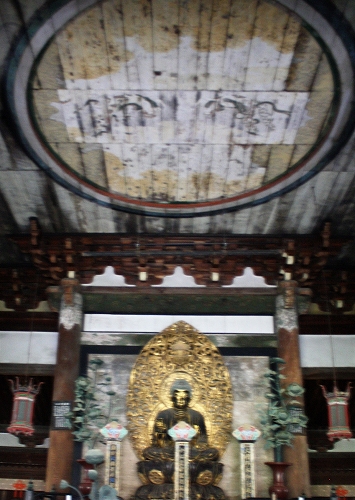 ![]() 《仏殿》 御本尊釈迦如来坐像と天を舞う、飛天。更に雲ですが劣化が進んでいます。 |