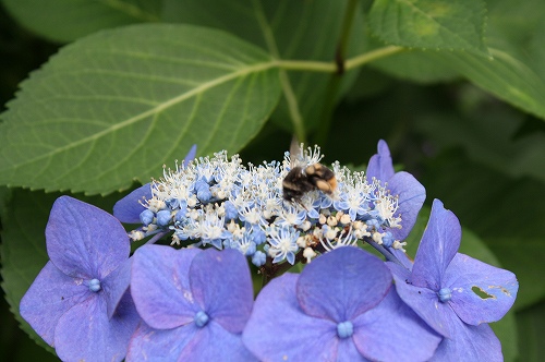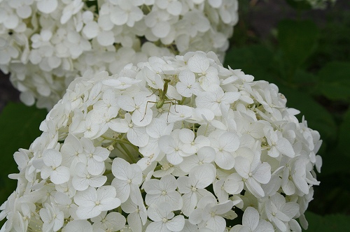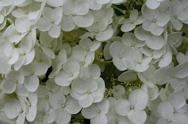 ![]() アナベルのようなこんもりしたアジサイは、装飾花をかきき分けると小さな真花が見えます。 |