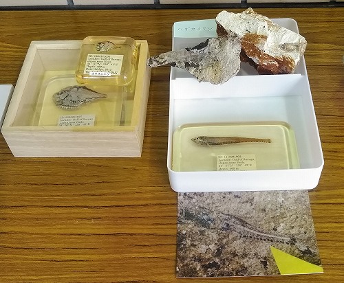 ![]() 本物が入り口に展示してありました 右)世界で初めて見つかったウニです |