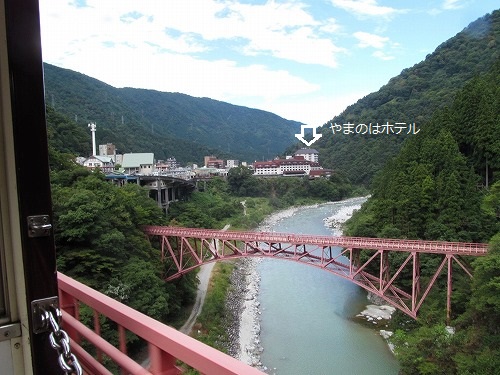 黒部川に架かる新山彦橋から山彦橋(奥に宿泊したホテル)