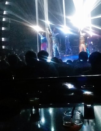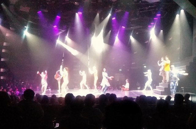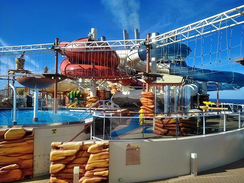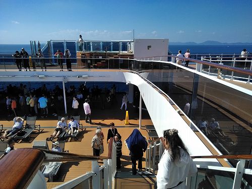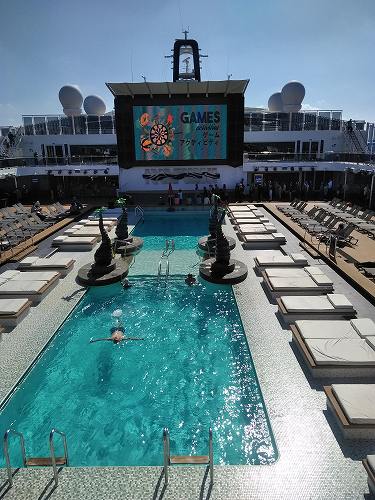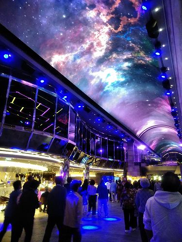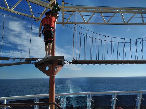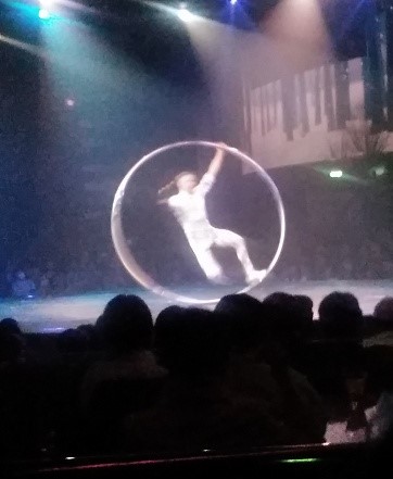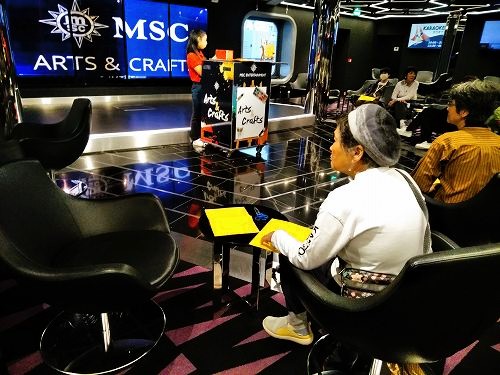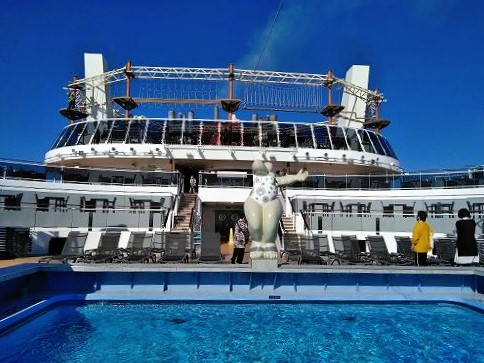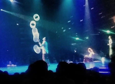 クルーズ船の散策をしてみた(寒いので誰も泳いでいませんが、日光浴はしていました) 安全ベルト装着して空中散歩?強風のため中止でした。 泳いでる人がいるではないか! 天井のスクリーンが刺激的! ディナー担当のブライアントさん(フィリッピンの方)です。 毎日『アート&クラフト』に通いました 前回中止になり、2回目3回目は船の揺れがひどく中止、4度目にようやく観戦。 右)横たわったここで中止だったシーン! 左)リング使ったテクニック技に釘付け 右)調子崩した主役の高速ジャグリングは凄かった