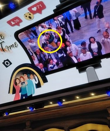 16:00桜島の噴火を見ながら出港 歩いてる姿がドームの側面に映像が、皆さん自分達を撮っています。