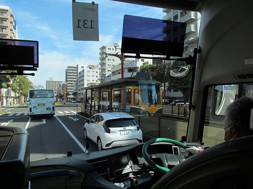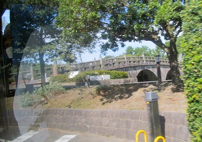 右)鹿児島駅に向かう市バス(バス停に並んだらすぐ行列が乘れない人ができたぐらいです)の中から、有名な石橋らしい!