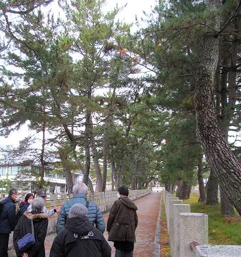 7:00朝食>9:00法隆寺へ 本来の松並木参道 昔々ここで籠から降ろされた(下馬ならぬ下籠かな?)