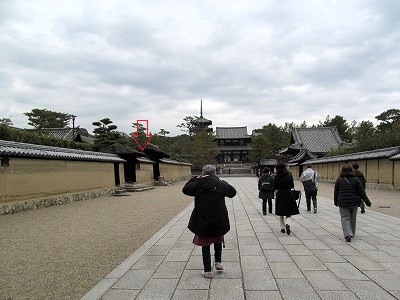 矢印の土塀が左に少し入って奥が広くしてある。 そうすることにより奥行きを感じさせないので五重塔が近くに見える。