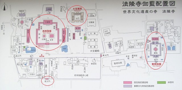 聖徳太子と推古天皇が創建したと伝わる寺。世界最古の木造建築物の金堂、五重塔など、19棟の国宝と、50以上の重要文化財を持つ。