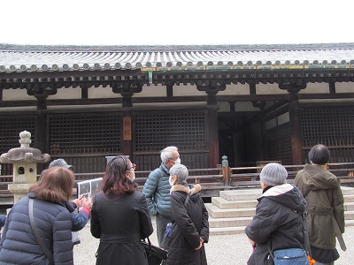 『夢殿』聖徳太子の遺徳を偲んで739年に建立と『伝法堂』をボランティアガイドさんの説明を聞く (芥子粒のような釈迦の骨を説明)