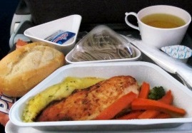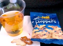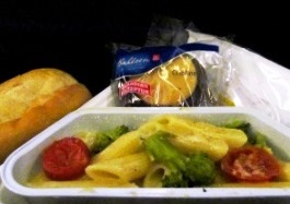 ![]() 機内食:おやつ>昼食>夕食です・・・ペンネはおいし〜い!パンはそれぞれの好みですね? |