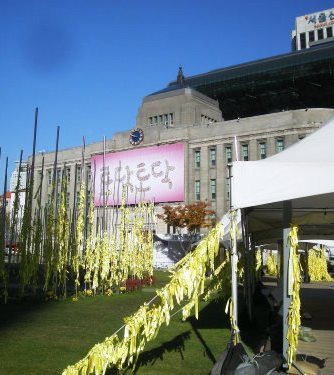 ![]() 市庁舎で黄色いテープはフェリー事故の霊を慰める為に広場に市民が縛っていった黄色のテープ群です。 |