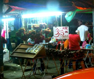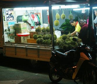 ![]() バスからは生活感が分かるドリアンの屋台風景が見えます。 んん!「猫」を売ってる?拡大してみたら・・・ ドリアンの種類のマオシャンワン猫山王(マウンテンキャット)でした。 最高級とされる逸品だそうです。 |