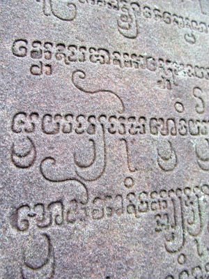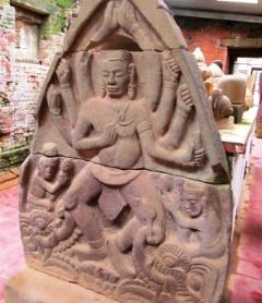 ![]() ヒンドゥー特有の文様やサンスクリット語が刻まれた石板も発見!(首のない石造は発掘者が持ち去る) |