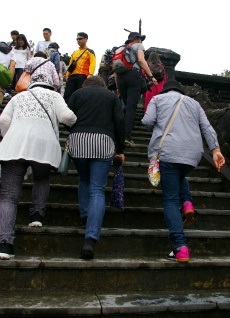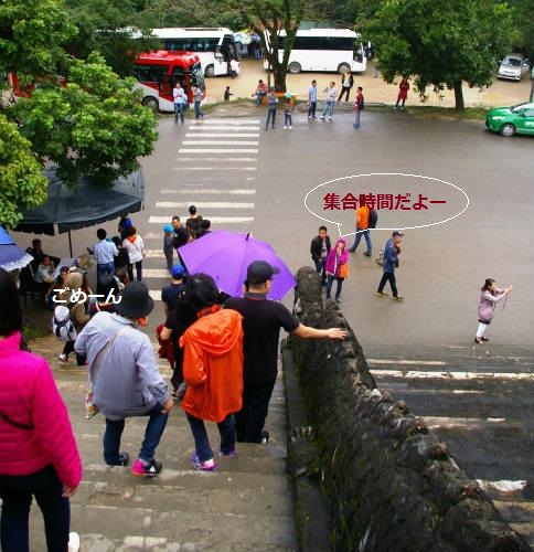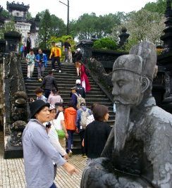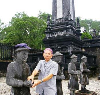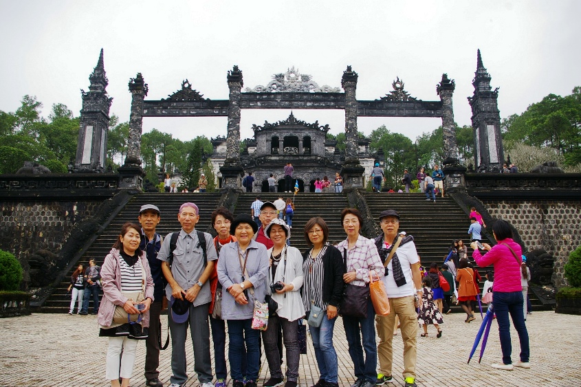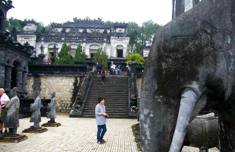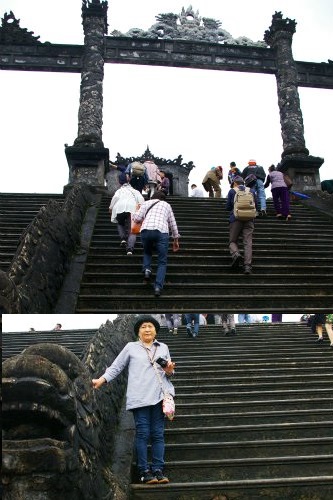 ![]() ベトナム最後の王朝があった古都フエです。ベトナムにおいて最初に世界遺産に登録されたエリアであります。 カイディン帝廟 駐車スペースが狭く、雨上がりの道に注意しながら、廟の前までやってきました。 最初の急階段を登ると広い踊り場があります。 続き2番目の階段を見た所で記念写真を! |