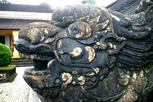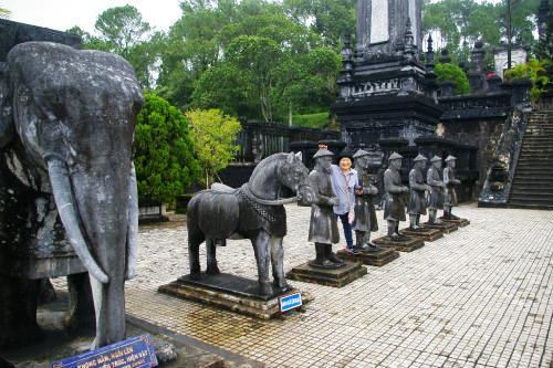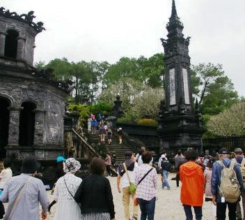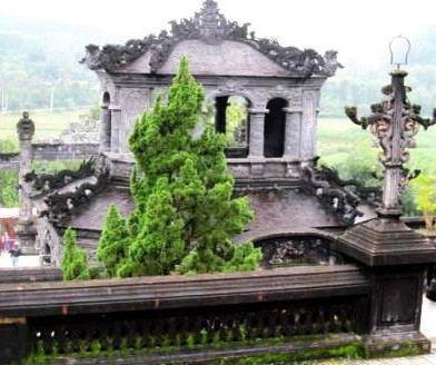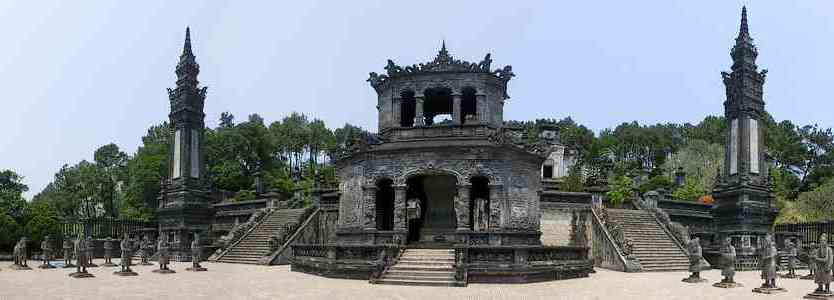 ★ 1920年からカイディン帝の死後6年経過した1931年まで、12年かけて造られた西洋風の建築で、 芸術的に優れた廟は、石の階段の手すりには竜が刻まれ階段の上には馬や象、役人の石像が立ち、廟を守っている。 |