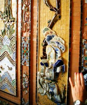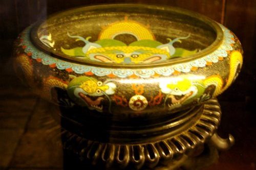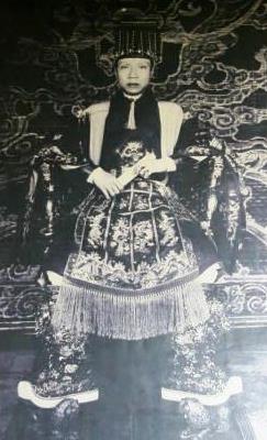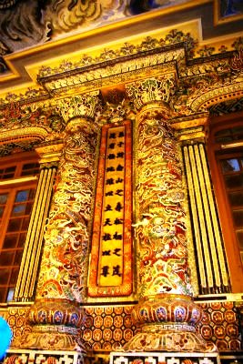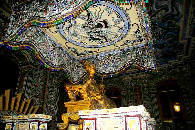 ![]() 廟の内部には金箔を押した青銅のカイディン帝の等身大の像があり、下に皇帝の遺体が安置されている。 壁と天井は中国の磁器や日本のガラスでステンドグラスのように飾られていて美しい。 カイディン帝は、阮朝最後から2番目の帝で、晩年はフランスに亡命していました。 |