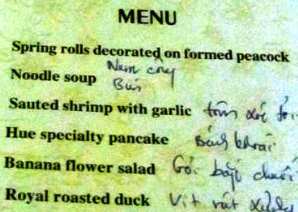![]() ![]() ![]() フエ料理の中の『宮廷料理』 一般的には高級な場所で高級な食材を使い、料理外観に装飾をあしらったもの。 ![]() ![]() ![]() メニューは6種類の宮廷料理コースだけ。 VND200000(≒1150円)〜400000(≒2300円)の中から選ぶのだが、内容から行ってVND200000のコースだな! デザートは生け花みたいなものは、飾りではなく餡の入ったお菓子とミカン1個。 |