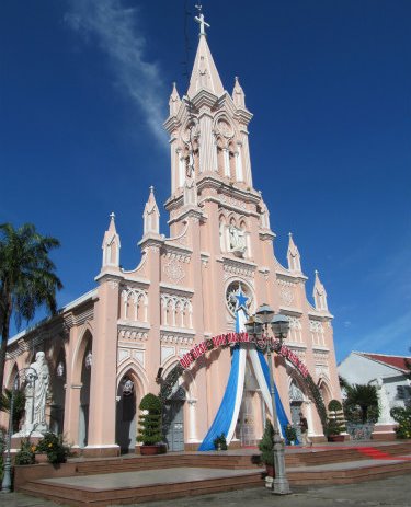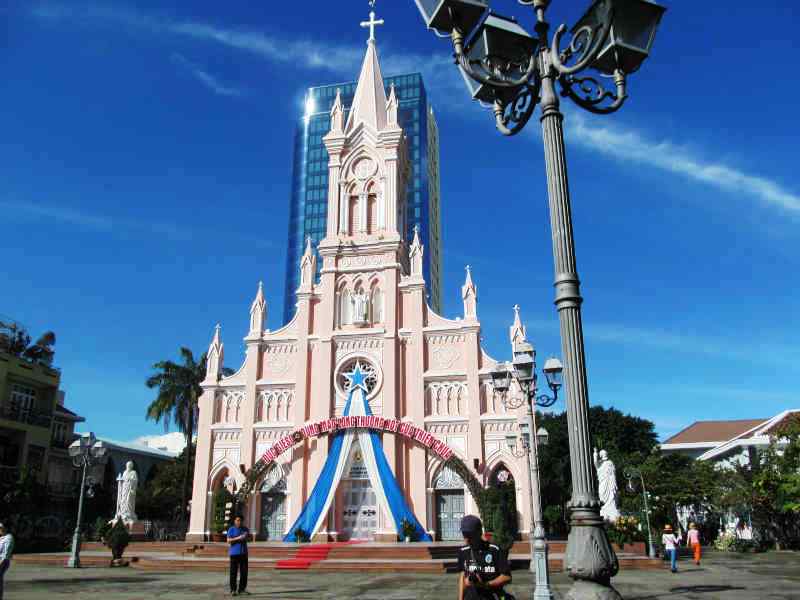![]() ダナン大聖堂に無事到着・・・ピンク色に驚く、中には入ることはできませんでした。 |