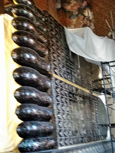 ![]() 涅槃仏とは、釈迦が入滅する様子を 仏像で表したもの。 足の裏には宇宙観の108場面が描かれる。 |
