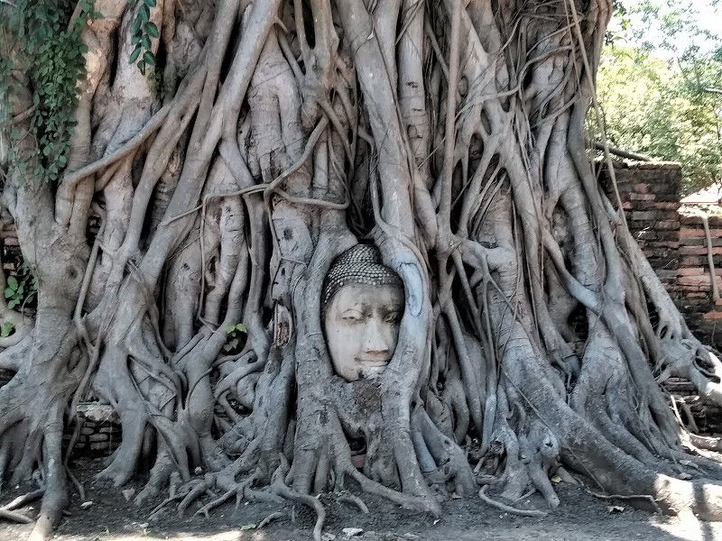![]() ビルマ軍の侵攻の際に落とされた仏像の頭部が、長い年月をかけて菩提樹に覆われて上昇してきた。 |