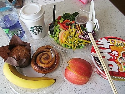 ![]() 簡単な夕食を部屋で食べます(持ってきたカップ麺は食べつくして) |