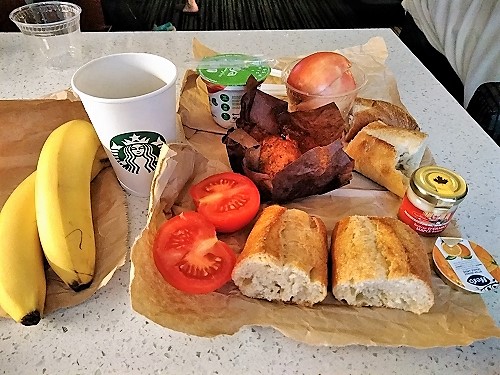 ![]() スーツケースを預けスーパーで買った果物とドリンク類は持込厳禁なのでここで食べます |
