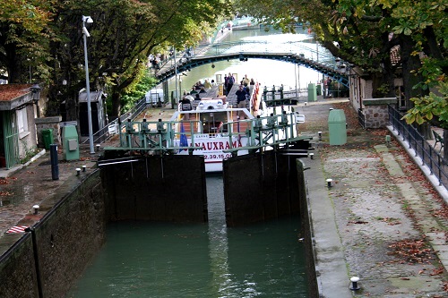 パリ市内 『サンマルタン運河』はいくつもの水門を 超えて上っていく。 |