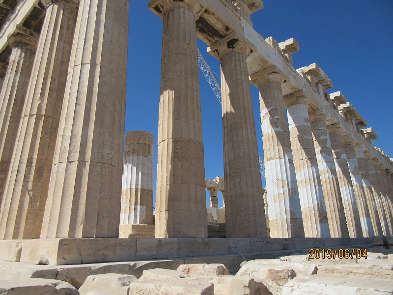 ![]() 天を支えているような神殿の柱(ドーリス様式・溝が20本・真ん中が膨らんでいる) 4500年前 約2500年も前の様式ですが、その後少しずつ形を変えながら世界中に広がり(遠くは日本の法隆寺や唐招提寺の柱の形にも影響を与えた) |
