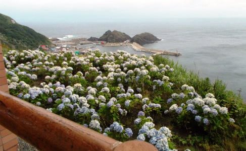 ![]() 2泊目は竜飛岬温泉 ホテルの紫陽花の向こうに帯島 |