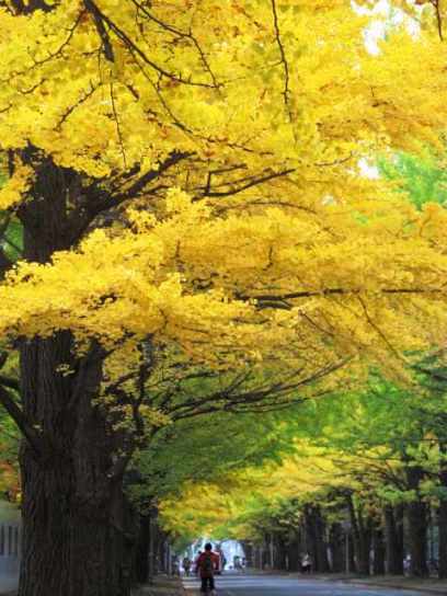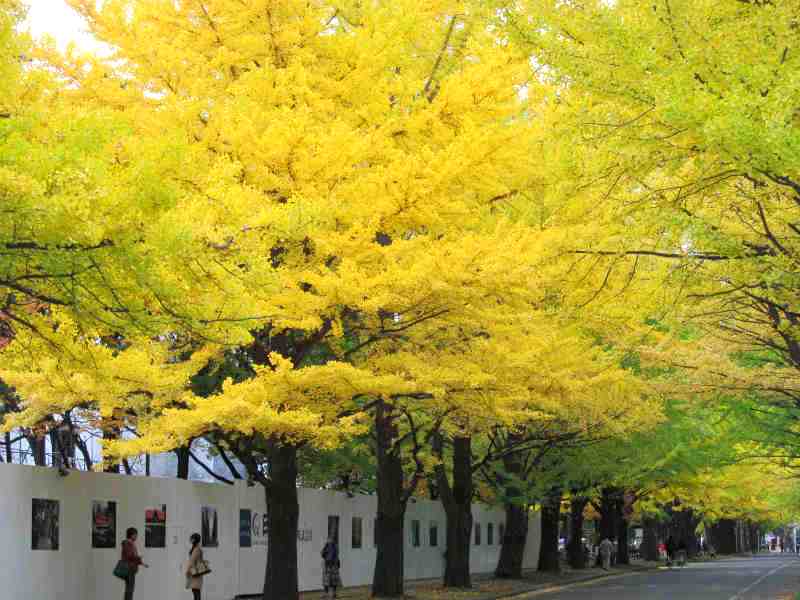 ![]() 380mの道路の両側に70本のイチョウ並木が続く |