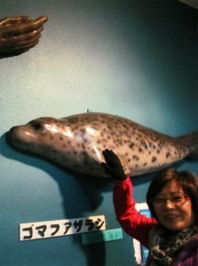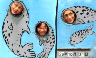 ![]() ![]() ![]() 三匹のアザラシに迎えられ到着です。シャトルバスは3分で坂道を運んでくれます。 |
