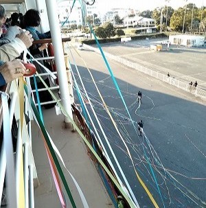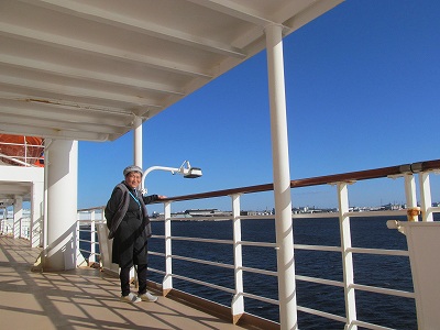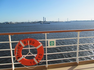 Pm5:00出港 強風のデッキでシャンパンをもらい、ほぼ見送りのいない岸壁にテープを投げる。