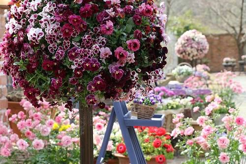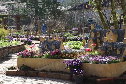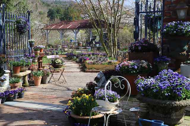 入園して最初に見るアジアンローズガーデンですがバラは咲いていません。 パンジーのアレジメントが目を引く!