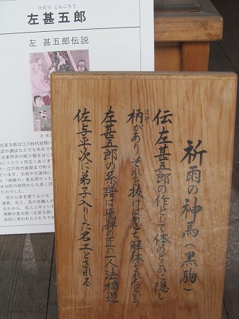 昔々に毎夜厩舎を出て農作物を荒らし、収穫の頃の稲穂を食ったとして村民が黒駒の両目を抜き取ったところ、以来耕作地を荒らすことが止んだと伝えられます。