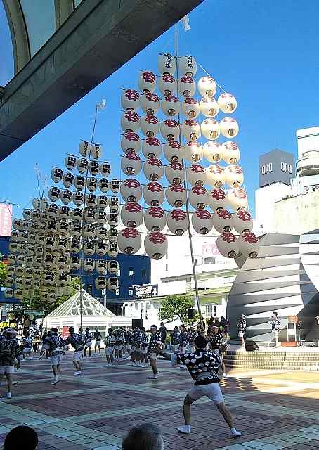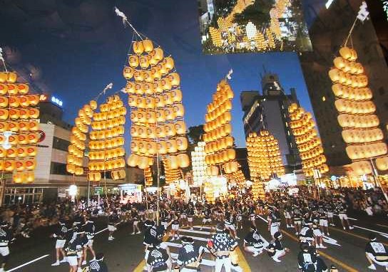 竹の竿燈をかざし、 竿は長さが 12 m、重さは 50 kg にもなります。先端に付けられた紙の提灯の一つ一つには、なんと実際に火が灯されています。