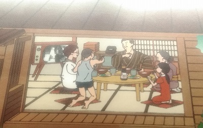 我が家も丸いちゃぶ台を囲んだ食事風景! 最後においしいけど桃酢を飲んで、せき込む! 酢っぱくて「どうも酢いません」