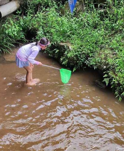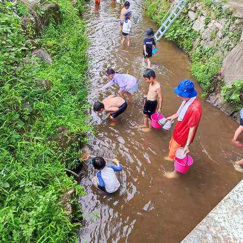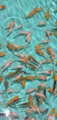 鯉の稚魚を投げ入れてもらい、本来はつかみ取りだがたも網で皆取ってます。子供二人で5匹捕まえたが、自分も楽しみます。 リーリースして帰る。