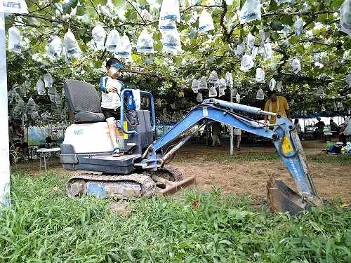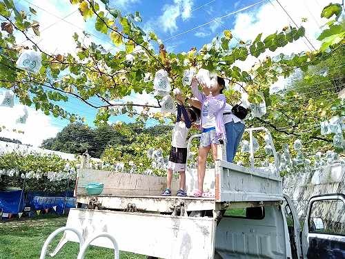 軽トラのリフトを上げてもらい巨峰を4房刈り取る